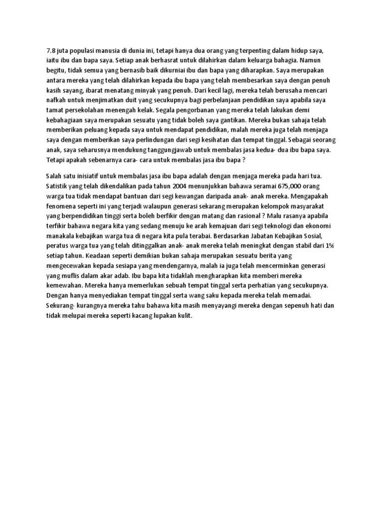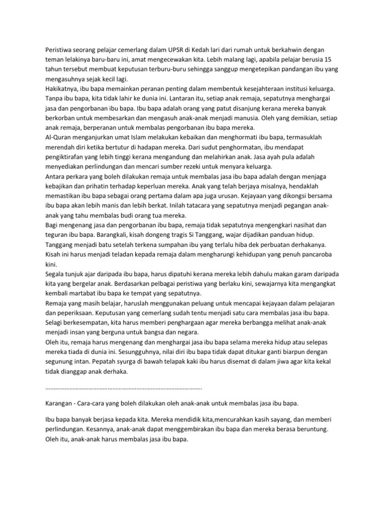 Ibu bapa merupakan insan yang banyak berjasa kepada kita. Mudah untuk mengatakan saya sayang ibu dan ayah saya. Pengorbanan ibu bapa kepada kita sangat besar dan tidak dapat dinilai dengan wang ringgit. Kita hendaklah membalas jasa baik mereka. Justeru, kita mestilah membalas jasa ibu bapa. Kisah si tanggang yang semakin mewarnai . (menulis secara imlak perkataan dan frasa). Adakah dengan ungkapan sahaja sudah menunjukkan kasih dan . Jika dikira jasa ibu bapa, pasti ia takkan terbalas. Contoh karangan cara mengenang jasa ibu bapa jasa ibu bapa kita tiada tandingannya maka janganlah kita sesekali mengabaikan ibu bapa. Ibu ialah orang yang melahirkan kita manakala bapa orang yang mencari .